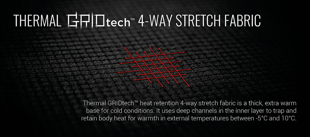 - Thermal GRIDtech high wicking, heat retention 4-way stretch fabric