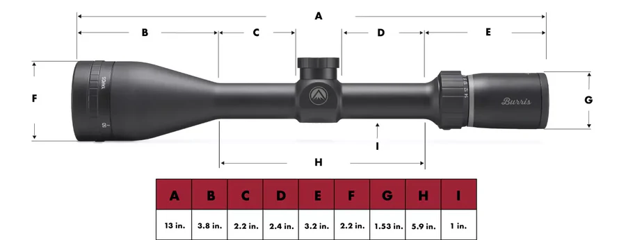 Item Number | Reticle | Color | Knob Style | Illumination | Magnification | Objective Diameter | Objective Lens Diameter | Finish | Ocular Diameter | Focal Plane | Main Tube Size | Field of View | Eye Relief | Exit Pupil (low - high) | Click Value | Elevation Adjustment, Total Capability | Windage Adjustment | Parallax/Focus | Parallax | Length | Weight |