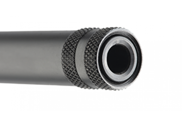 M14 Muzzle thread for mounting accessories, protected by a knurled thread cover.