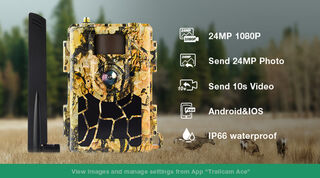 This game/trail camera features a waterproof and dustproof camouflage design, and with it's technology it can be the perfect tool for monitoring areas where a stable power source or an Internet router is not accessible. Therefore, the camera can be powered by batteries (8 AA batteries) or from an external 12V battery and must include a SIM with active data. Under these conditions, makes it suitable for hunting and to observe animals and plants. It can also be used for home security, property surveillance, scouting farm and warehouse security and more.