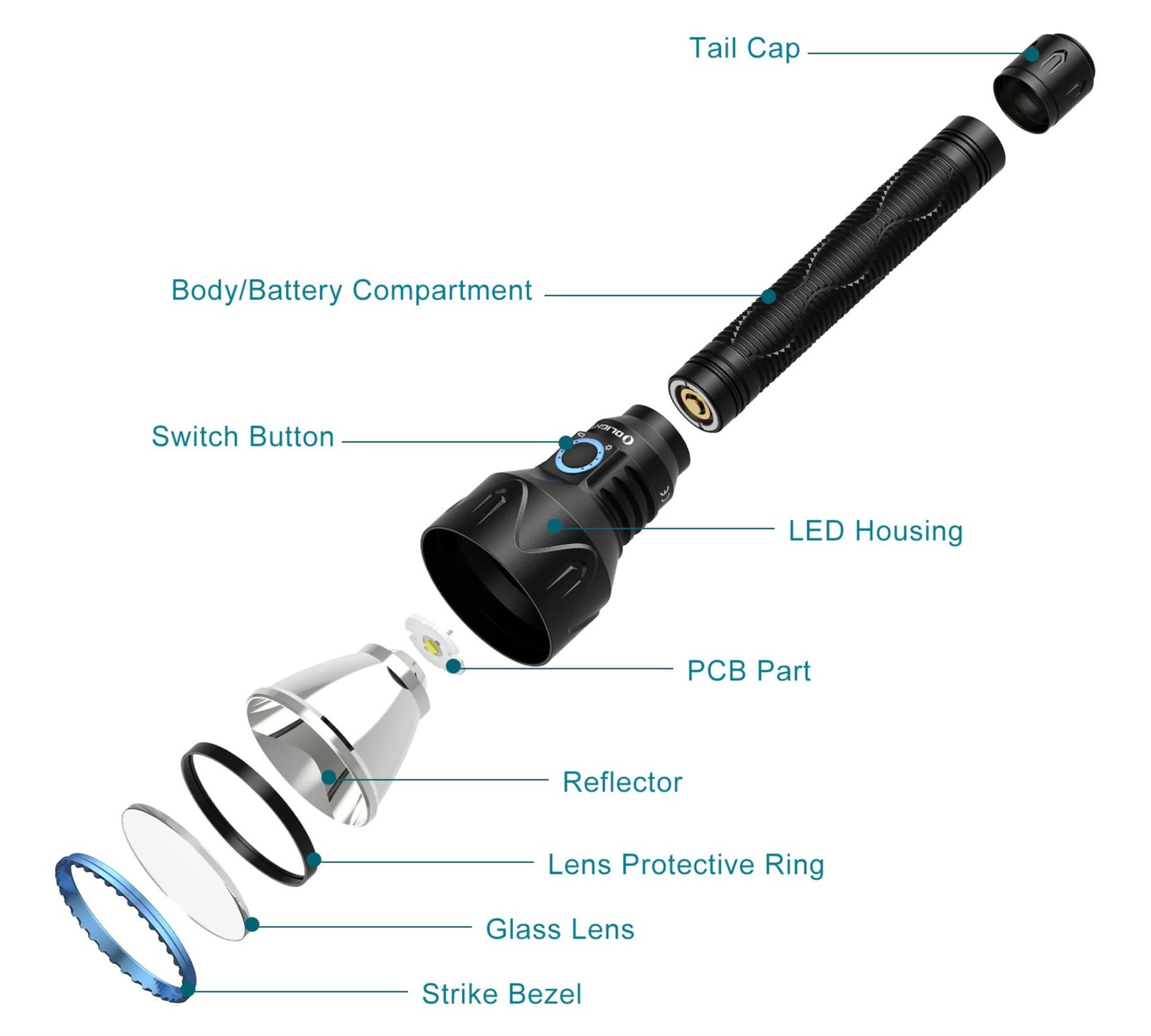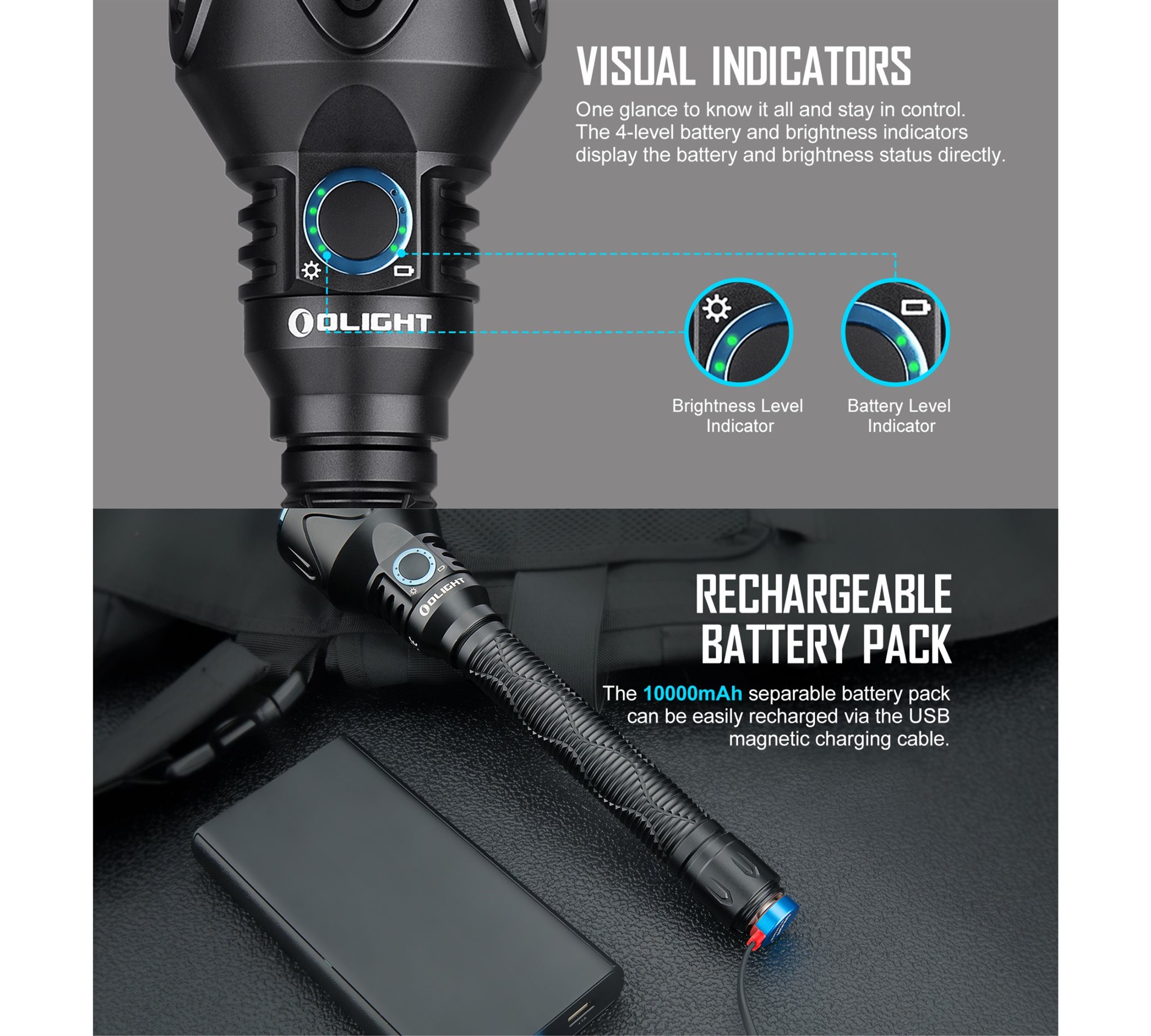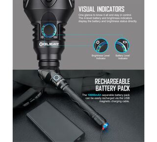 The Javelot Pro 2 adopts a replaceable battery pack (comprised of two 5000mAh 21700 batteries) for extended runtimes, which can be easily recharged via the MCC3 USB magnetic charging cable. The 4-level battery and brightness indicators around the side switch display the battery and brightness status in real time. Its rugged aerospace-grade aluminum alloy body comes with anti-slip knurling and allows it to pass with an IPX8 waterproof rating and a 1-meter drop test rating. With its paramount long-distance beam and brighter output, the Javelot Pro 2 is ideal for hunting as well as search and rescue.