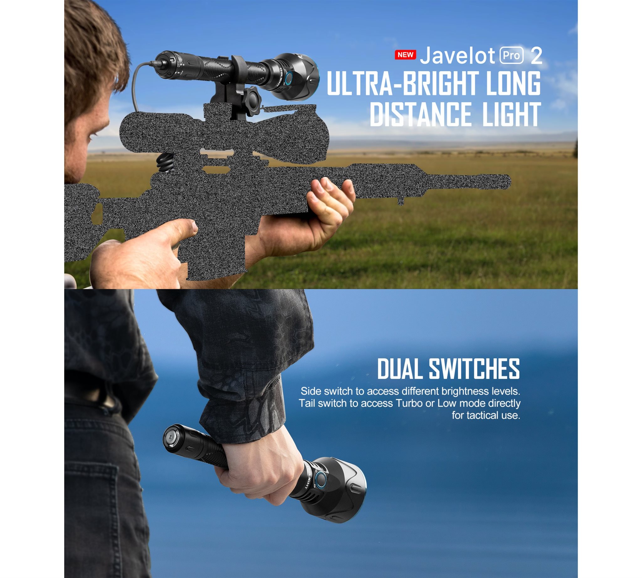 The Javelot Pro 2 is an ultra-bright long-distance thrower that can be used handheld or as a firearm mounted light. With a high-performance LED and deep reflector, it provides an unparalleled output of up to 2,500 lumens with a beam distance of 1,050 meters. The dual-stage tail switch allows quick and easy access to basic settings, while the side switch can be used to intuitively cycle through 4 brightness levels.