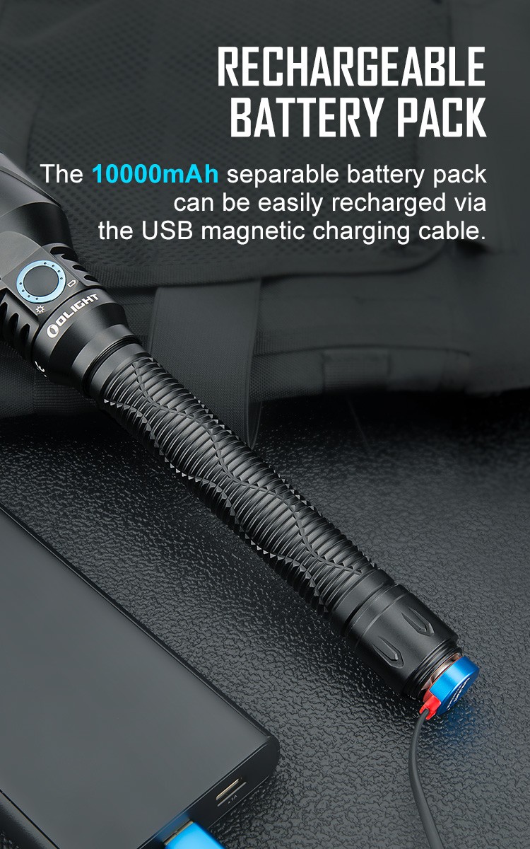 The Javelot Pro 2 adopts a replaceable battery pack (two 5000mAh 21700 batteries) for extended runtimes, which can be easily recharged via the MCC3 USB magnetic charging cable. The 4-level battery and brightness indicators around the side switch display the battery and brightness status in real time. Its rugged aerospace-grade aluminum alloy body comes with anti-slip knurling and allows it to pass with an IPX8 waterproof rating and a 1-meter drop test rating. With its paramount long-distance beam and brighter output, the Javelot Pro 2 is ideal for hunting as well as search and rescue.